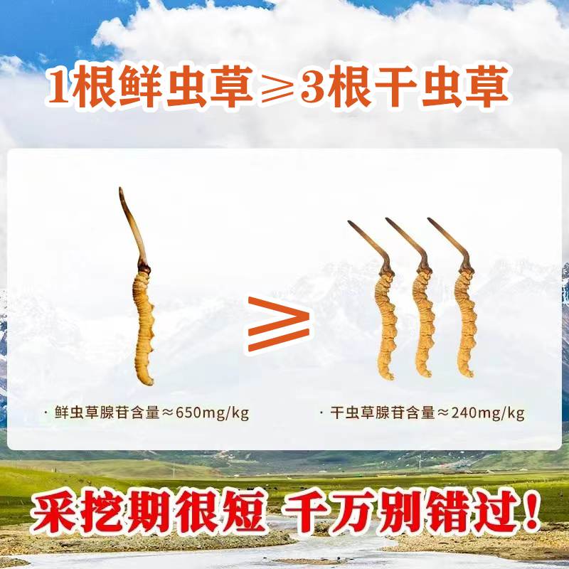 据冬虫夏草研究第一人沈**教授认为:“新鲜的冬虫夏草保持原生态,留住营养百分百,其营养价值和药用功效远高于干的冬虫夏草,1根抵3根干制虫草”