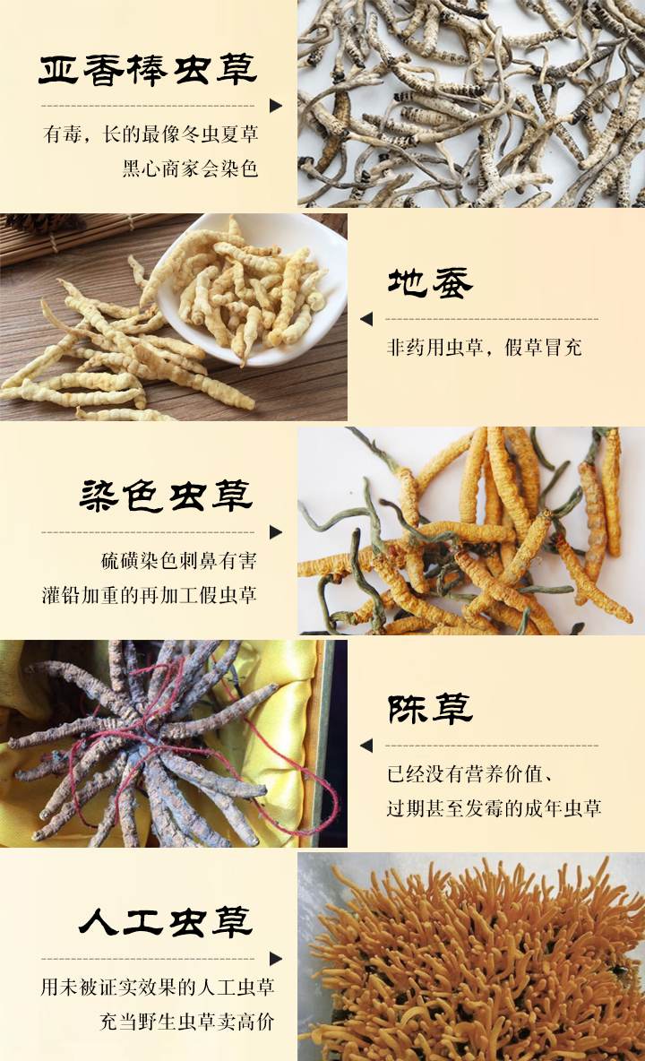 不像市场上存在的各种假虫草或者劣质虫草(如下图所示)不仅没有质量检测报告,还品相不好,没有什么营养,吃了没效果,而且价格还虚高。所以买虫草一定要认准藏民直供的冬虫夏草,这样不吃亏不上当,价格还便宜51%。